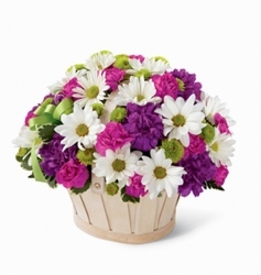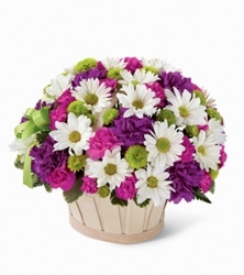 This pretty basket is sure to cheer up anyone's day. This white-wash handled basket is filled with green button pompons, white daisy pompons, hot pink mini carnations and purple carnations. A lavender ribbon bow completes your best wishes.