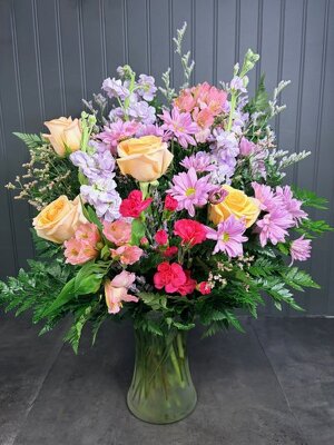 This one-sided arrangement is bursting with color and texture. It is filled with roses, stock, daisies, alstromeria and more! Perfect for spring or any occassion.