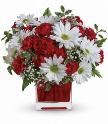 Make their day! Send your special someone this charming bouquet arranged in a ruby red glass cube. It's a gift that will surely delight!
