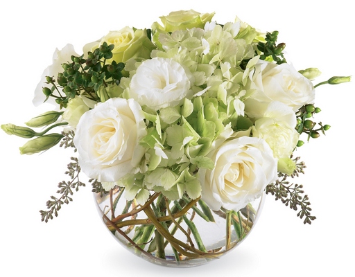 White and light green roses, gorgeous green hydrangea and green carnations along with white lisianthus accented with seeded eucalyptus and curly willow arranged in a clear glass bubble bowl.